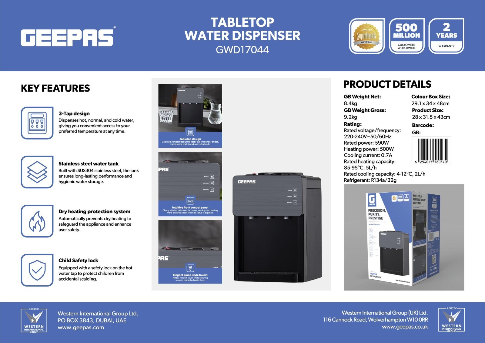 آبسردکن رومیزی سه شیر جیپاس GWD ۱۷۰۴۴ – Geepas GWD17044 Tabletop Water Dispenser