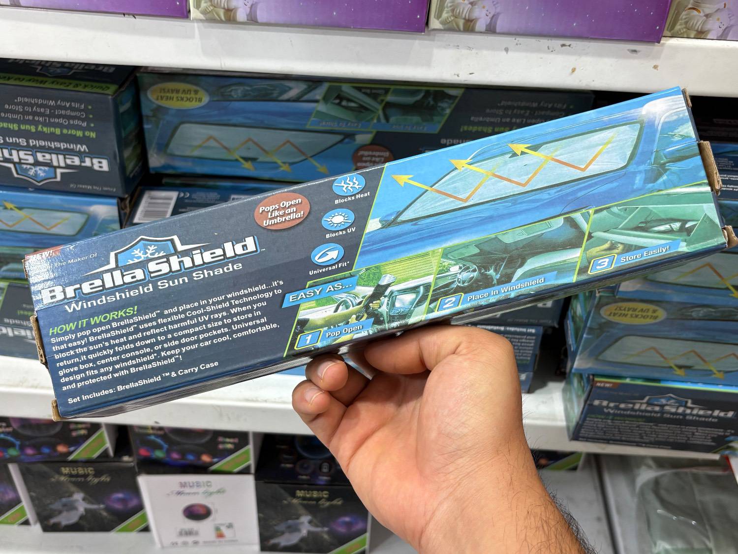 - باز و بسته شدن آسان (مثل چتر): طراحی فوقالعاده هوشمندانه این آفتابگیر باعث شده تا دقیقاً مثل یه چتر معمولی، با یه حرکت باز بشه (Pops Open) و روی شیشه جلو قرار بگیره؛ بدون نیاز به گیره، چسبک یا نصب پیچیده!