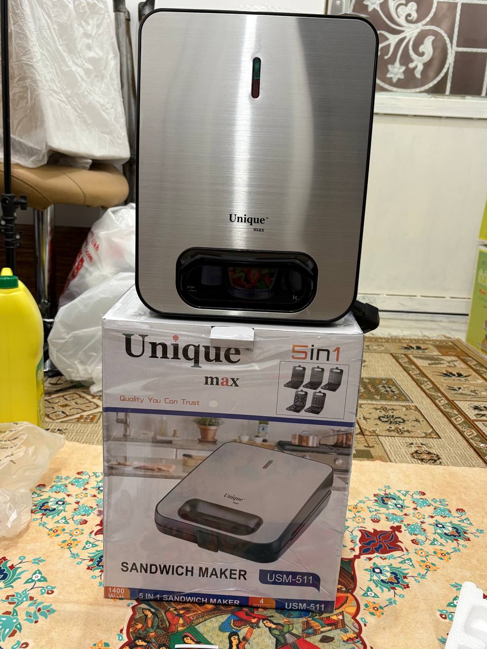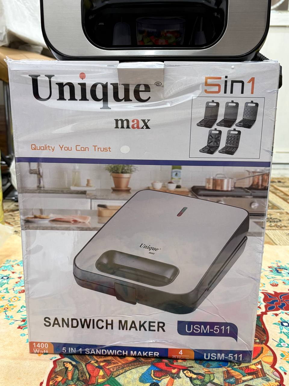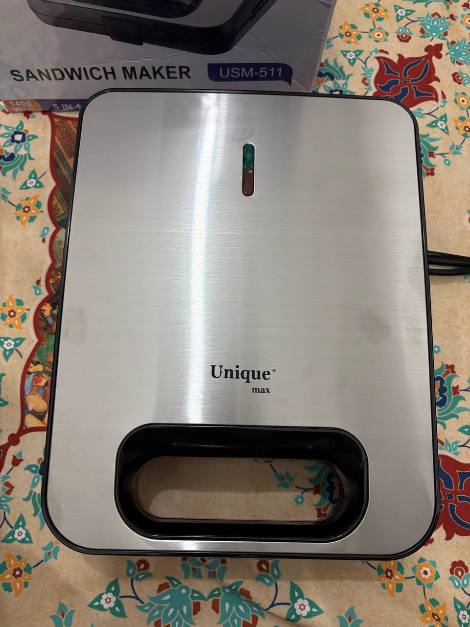 Unique Max 5-in-1 Sandwich Maker Model USM-511 with Interchangeable Plates دوست عزیز، اگر صبحانه یا میان‌وعده‌های سریع، متنوع و خوشمزه دوست داری، این اسنک ساز ۵ کاره یونیک مکس مدل USM-511 دقیقاً همون چیزیه که آشپزخونه‌ت نیاز داره! با ۵ صفحه قابل تعویض، می‌تونی در کمترین زمان ساندویچ‌های مثلثی ترد، وافل‌های طلایی، دونات‌های خانگی، بیسکویت‌های گل‌دار و حتی گوشت یا سبزیجات گریل‌شده آماده کنی. تصور کن صبح‌ها وافل تازه با میوه، یا عصرها اسنک پنیر و ژامبون داغ برای بچه‌ها – همه‌شون بدون دردسر و با طعم حرفه‌ای! بدنه استیل ضدزنگ و مقاومش هم خیلی شیکه و به راحتی تمیز می‌شه. صفحات نچسب هستن، پس مواد غذایی بهشون نمی‌چسبه و شستشوشون مثل آب خوردنه. چراغ‌های نشانگر قدرت و آماده بودن، کار رو امن و ساده کرده – فقط صفحه مورد نظرت رو بذار، مواد رو بریز و چند دقیقه صبر کن تا غذای داغ و کریسپی آماده بشه. ایدئال برای خانواده‌ها، دانشجوها یا حتی مهمونی‌های کوچک! ویژگی,جزئیات برند,Unique Max مدل,USM-511 نوع,اسنک ساز و ساندویچ ساز ۵ کاره با صفحات قابل تعویض عملکردها,ساندویچ مثلثی، وافل مربعی، گریل (شیاردار)، دونات، بیسکویت گل‌دار صفحات,۵ جفت صفحه نچسب و قابل جدا شدن بدنه,استیل ضدزنگ با طراحی مدرن و مقاوم کنترل,چراغ نشانگر قدرت (قرمز) و آماده بودن (سبز) تمیزکاری,صفحات نچسب، آسان برای شستشو مزایا,پخت سریع، تنوع بالا، مناسب خانواده این مدل یونیک مکس با تنوع صفحاتش، واقعاً یه آشپز چندکاره تو خونه‌ته! مشتری‌ها از کیفیت ساخت، سرعت پخت و راحتی تعویض صفحاتش خیلی راضی هستن. اگر می‌خوای صبحانه و میان‌وعده‌هات رو هیجان‌انگیز کنی، همین حالا به سبد خریدت اضافه کن و لذت ببر 😋