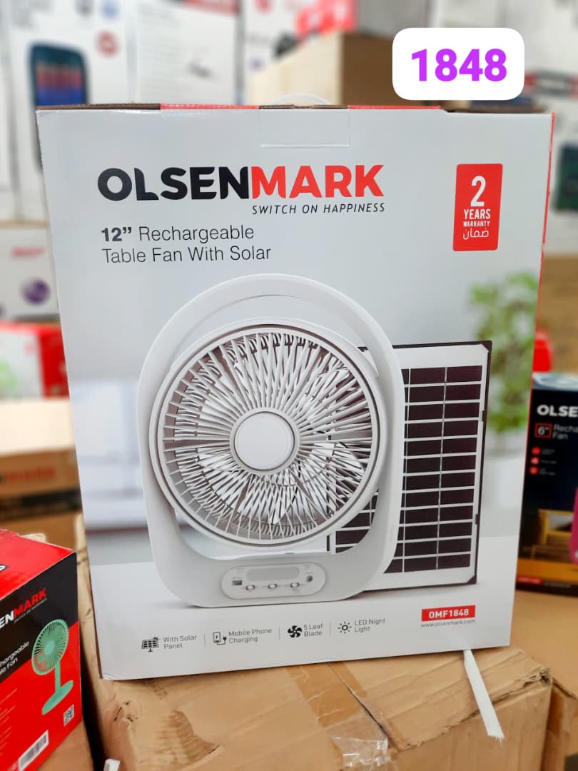 پنکه شارژی رومیزی ۱۲ اینچ اولسن مارک با پنل خورشیدی مدل OMF 1848 – Olsenmark OMF1848 12 Inch Rechargeable Table Fan with Solar Panel