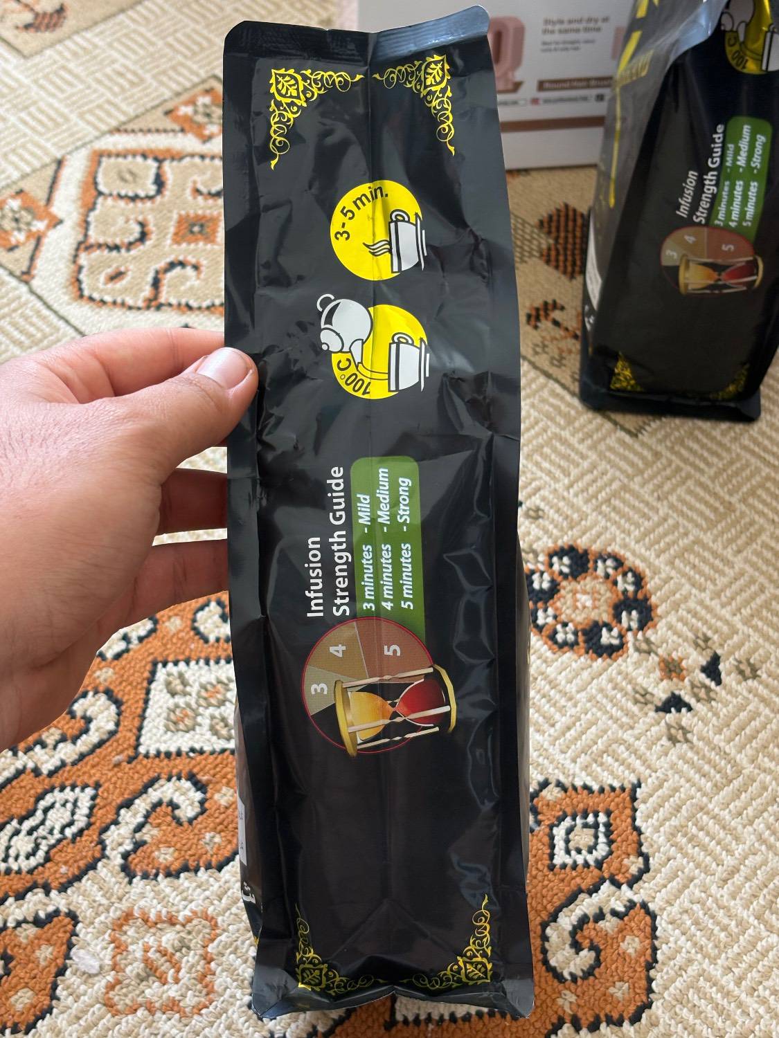 - بستهبندی محافظ: بستهبندی سلفونی ضخیم و مشکی رنگ با طرحهای طلایی، علاوه بر ظاهر شیک، به خوبی از چای در برابر رطوبت، نور و از دست رفتن عطر محافظت میکنه.